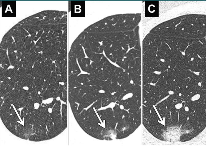 (图为肺结节在随访观察中的变化,其中A图为基线,B图为三个月后,C图为六个月后,该患者术后病理为浸润性腺癌)