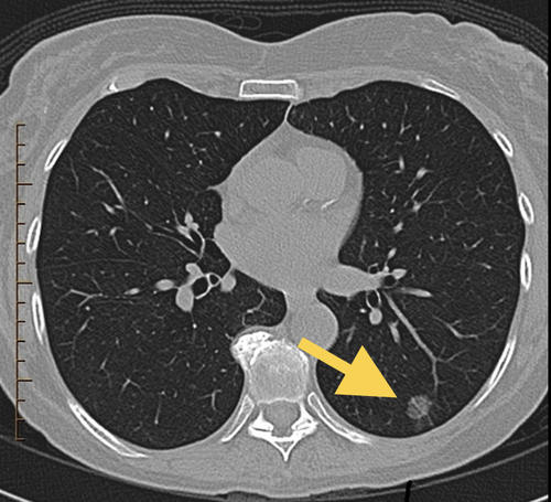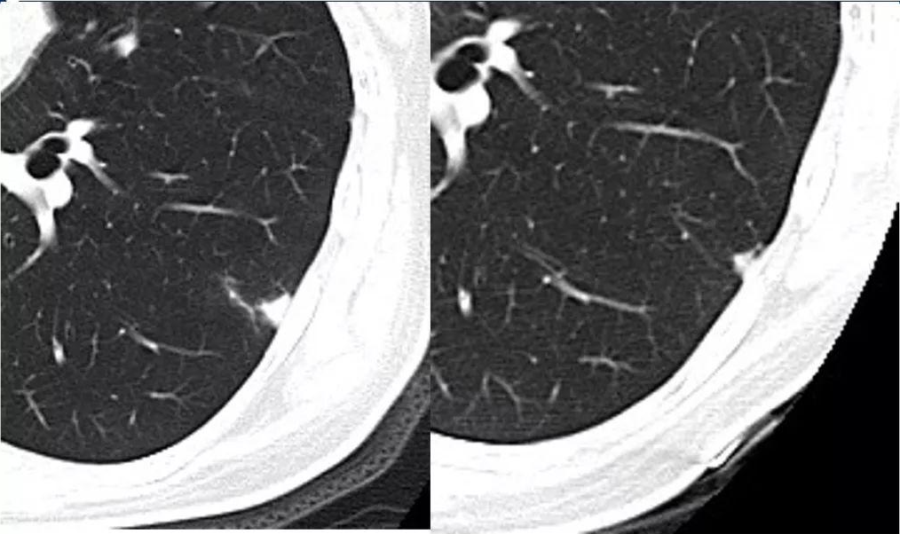 患者陈女士近日在单位体检中查胸部平扫CT时发现左侧肺部有一个直径约10mm的肺部纯磨玻璃样结节(如图,磨玻璃结节指:密度较低,在CT图像上像一块磨玻璃似的病灶)。