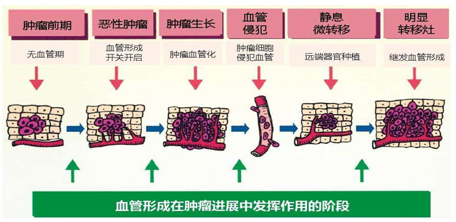 与肿瘤生长相关的有六大关键机制,“持续血管生成”是导致肿瘤复发、转移最为重要的因素之一。所以,抗肿瘤血管生成是肿瘤治疗中最为有效的一种手段。