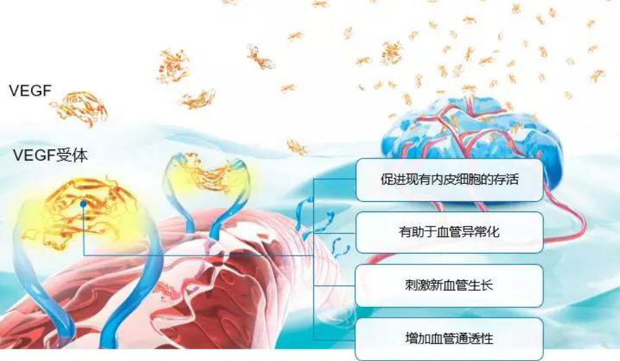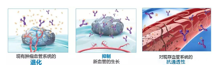 抗肿瘤血管生成治疗,可以与肿瘤释放的血管内皮生长因子结合,阻止VEGF与血管内皮细胞上的特定部位(VEGF受体)结合来抑制肿瘤血管生成,从而将肿瘤的给养切断,达到阻止肿瘤生长的目的。