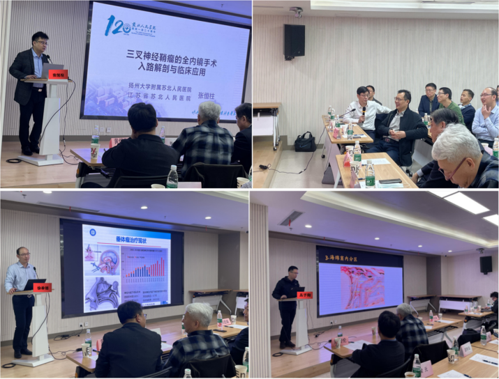 第一节会议由南通大学附属医院施炜教授和南京脑科医院杨坤教授主持。来自扬州大学附属苏北人民医院的张恒柱教授给我们介绍了4例全内镜下手术切除三叉神经鞘瘤的病例,无论是采用经乙状窦后入路还是颞下入路,精湛的操作技术让人大开眼界。南通大学附属医院徐希德教授介绍了垂体瘤神经内镜下规范化手术治疗的个人体会,围绕明胶海绵在经鼻内镜垂体瘤手术中的应用、双鼻腔通道的建立、包膜外切除肿瘤以及颅底修补,发表了个人独到的见解。中国人民解放军东部战区总医院马驰原教授因故未能参会,特地委托丛子翔医生介绍了海绵窦的内镜经鼻颅底解剖,丛医生从基础解剖再到实战视频解剖,详细地讲解了围绕海绵窦段颈内动脉周围的神经血管结构,让人获益匪浅。