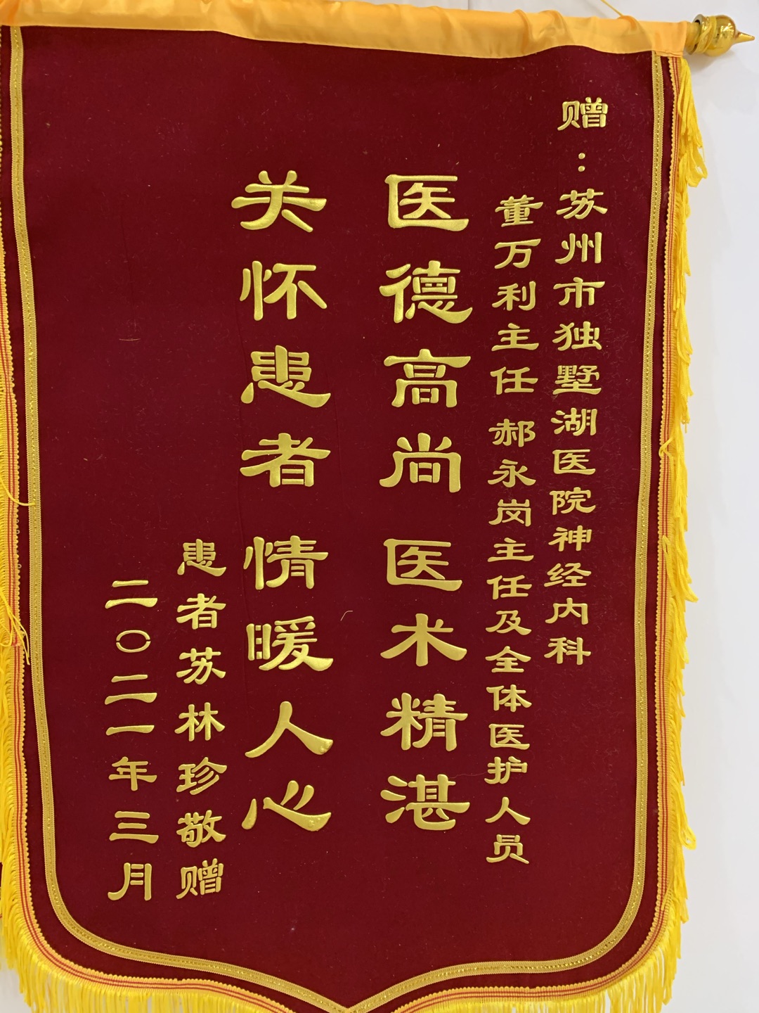 患者苏女士赠送锦旗感谢我院神经内科董万利主任、郝永岗主任医师及全体医护人员
