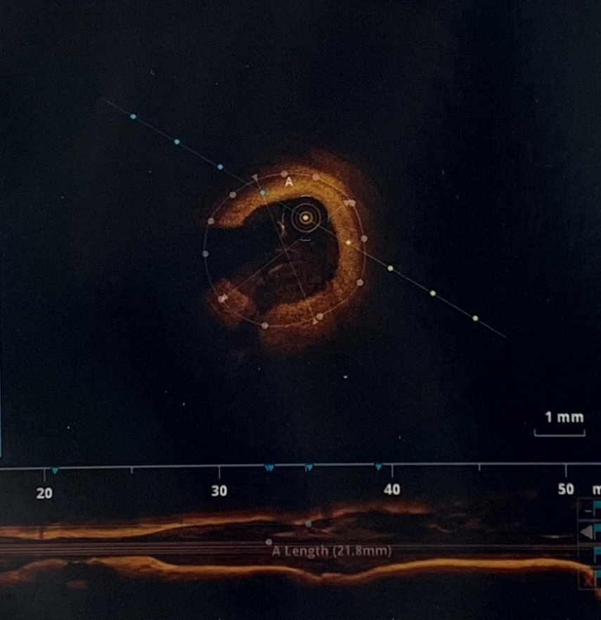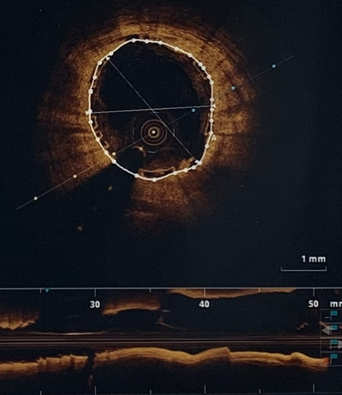 手术开始后,为了更精准判断冠脉病变情况,确保可吸收支架贴壁良好,周亚峰副院长、张强主任对患者进行了血管内光学相干断层成像(OCT)检查,经过预扩球囊的充分扩张后,植入3×24mm的生物可吸收支架。手术后经过OCT再次检查确认,支架膨胀及贴壁良好,支架边缘未见夹层,手术取得圆满成功。