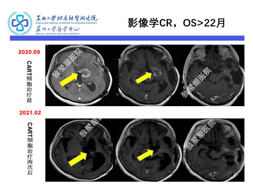 近期,在苏州市独墅湖医院(苏州大学附属独墅湖医院)神经外科在最近的临床试验中,也取得了重大突破。患者王女士,于2020年8月20号行脑胶质瘤左额叶恶性肿瘤切除术,胶质瘤3级。术后1月发现左额叶肿瘤复发。行放疗后症状加重,11月9号患者神志朦胧,左侧肢体刺痛无反应。再次手术切除大部分肿瘤后植入omaya囊,之后11月30号开始cart细胞治疗,12月2号进行第二次治疗。之后患者症状逐渐好转,于今年1月和2月分别再次进行cart细胞治疗,目前神志清醒,可自行下地活动。
