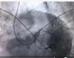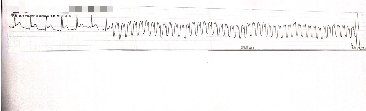 周亚峰副院长和张强主任接到消息,判断病人情况危重,急需手术治疗,立即至导管室进行各项术前准备,严阵以待。然而,刚抵达导管室门口沈先生就突发室速室颤、意识丧失、抽搐和呼吸停顿,随行医务人员立刻就地抢救,边进行心肺复苏边将沈先生转移至手术台上。手术过程中沈先生仍有室速室颤反复发作的情况,共进行8次紧急电除颤(见图1),术中导丝通过冠脉导管迅速送至冠脉血管,发现前降支近主干段完全闭塞(见图2),回旋支开口至近段狭窄50%,右冠开口狭窄约80%,周亚峰副院长以最快速度开通“罪犯血管”,于前降支近段植入支架一枚(见图34)。经过一个多小时的抢救和手术,患者胸痛症状明显减轻,手术取得圆满成功。