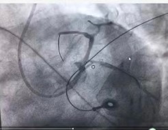 图2 前降支近主干段完全闭塞           图3 前降支近段植入支架一枚,开通血管