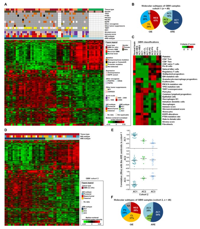 在本研究中,研究人员利用胶质母细胞瘤患者的肿瘤样本以及正常脑组织样本作为研究对象,采用了基因测序、对H3K27ac进行大规模免疫染色质沉淀并行测序分析等研究手段。研究人员首先参照GBM内在基因表达的特性,根据基因测序数据将胶质母细胞瘤分为三个亚型:经典型、间质型和前神经元型。再对H3K27ac表观遗传的测序数据进行分析比较,将胶质母细胞瘤分为三个亚型: AC1 , AC2, AC3。研究人员为进一步分析表观遗传调控与GBM内在基因表达分子亚型之间的相关性,将两者数据进行深入分析,发现本研究中85%的胶质母细胞瘤患者可分到四个相关的整合分子亚型:AC1-经典型,AC1-间质型,AC2-前神经元型和AC3-前神经元型。这为胶质母细胞瘤的分子分类提供了新的方向(图1)。