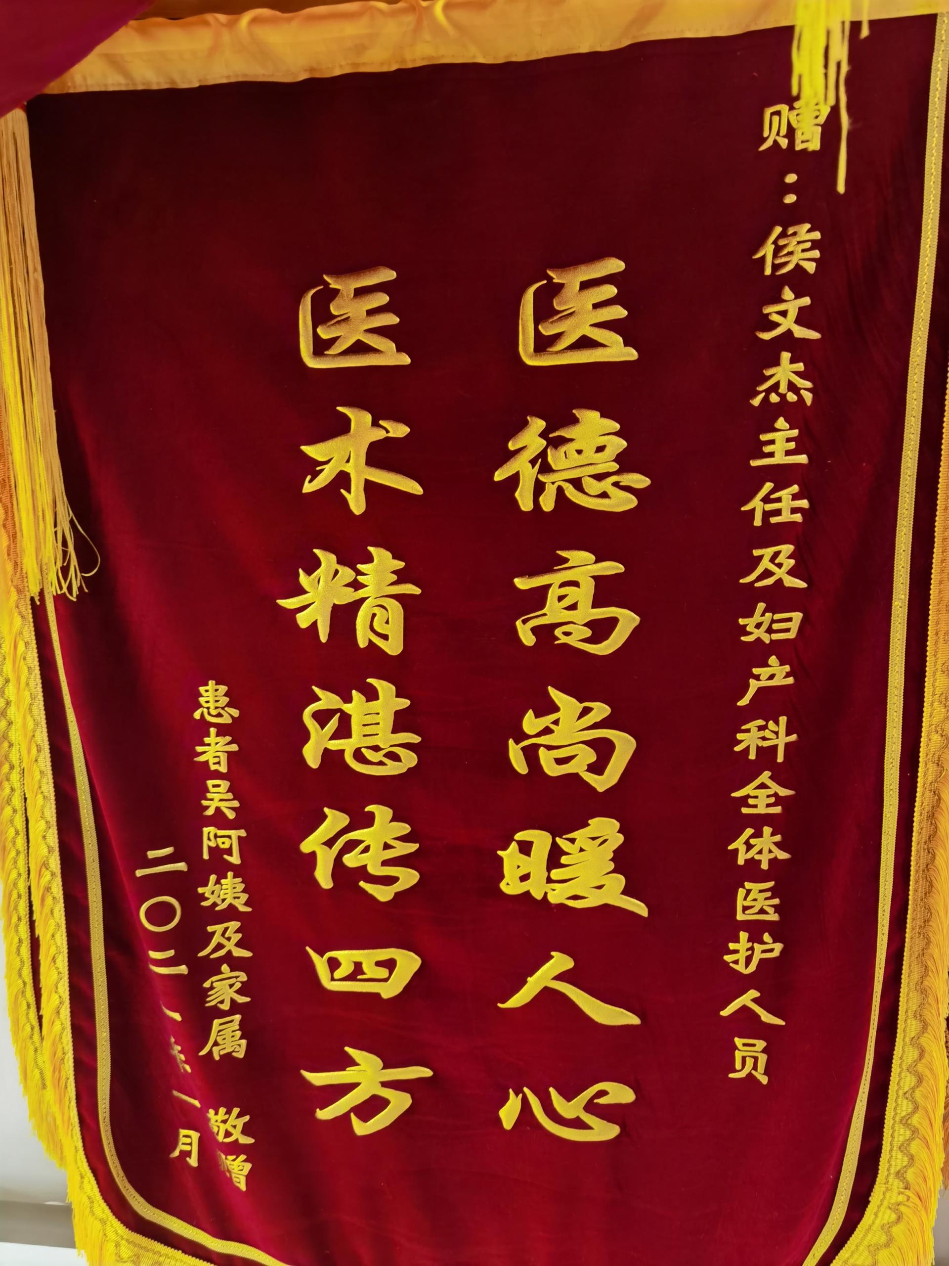 患者吴阿姨及其家属赠送锦旗感谢我院妇产科侯文杰主任及全体医护人员