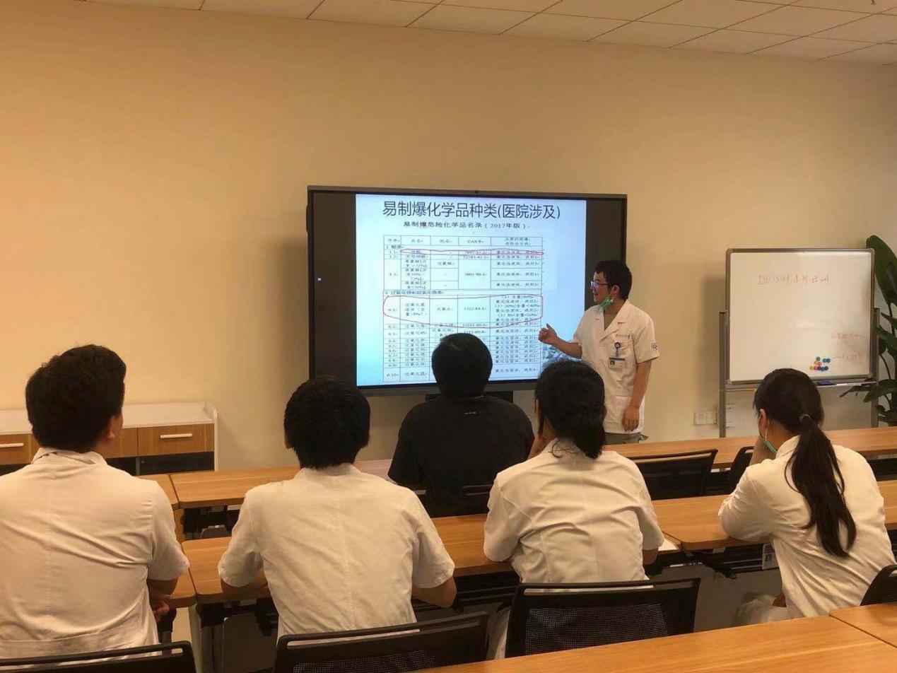 首先,医学工程处张博为相关人员进行了危化品相关知识的培训,耐心讲解了危化品的分类、保存、运送、台账等管理要求。