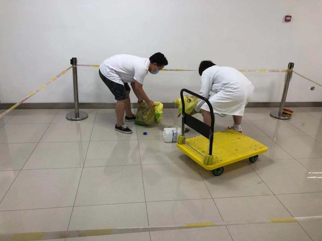 随后,在负一楼进行了危化品泄露应急处置的安全演练,后勤保障部、医学工程处、实验室及保安等相关人员进行了实战演练。危化品在运送途中发生少量泄露,运送人员紧急联系保安、实验室专业人员。相关人员在接到报告后迅速赶往现场,保安拉起警戒线及时疏散周围人员,实验室专业人员对泄露的危化品进行危害判断后进行相应处理。危险消除后,现场警戒解除。