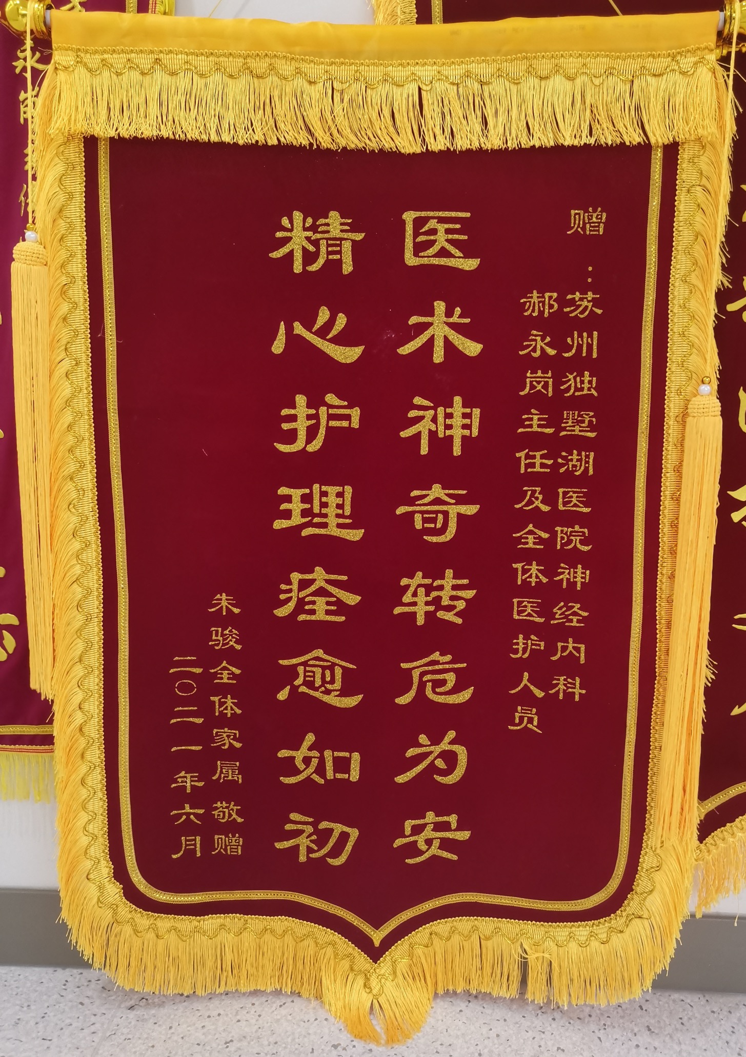 患者朱先生全体家属赠送锦旗感谢我院神经内科郝永岗主任及全体医护人员