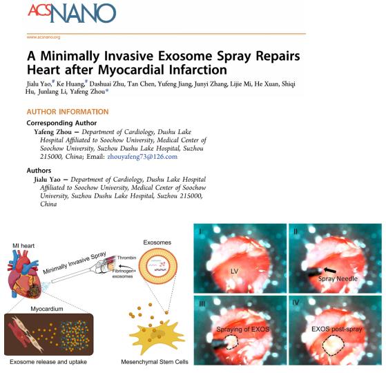 其中“A Minimally Invasive Exosome Spray Repairs Heart after Myocardial Infarction”发表在一区TOP期刊ACS NANO(IF:15.88)。研究结果表明,使用微创外泌体喷雾剂(EXOS) 是一种有前景的策略,可以为心脏修复提供治疗性外泌体。