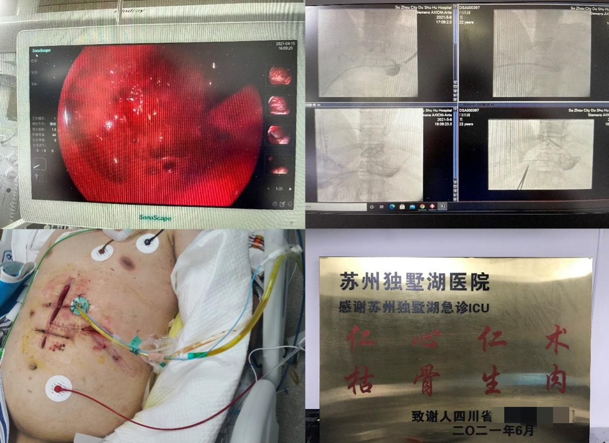 体重近300斤的小伙,从外院转来,诊断为急性重症胰腺炎、急性呼吸窘迫综合征。予以气管插管、升压药维持血压,治疗过程中反复出现消化道出血,伴随大量呕血、便血,复杂腹腔感染等并发症。经历两次开腹手术、三次床旁胃镜止血、DSA下穿刺并重新置管引流,经过多学科MDT讨论,与普外科、介入与血管外科、超声科、消化科、麻醉手术科科、急诊ICU等多科室、多专业的医护人员通力协作,历经两个月时间,终于使得患者转危为安,痊愈出院。