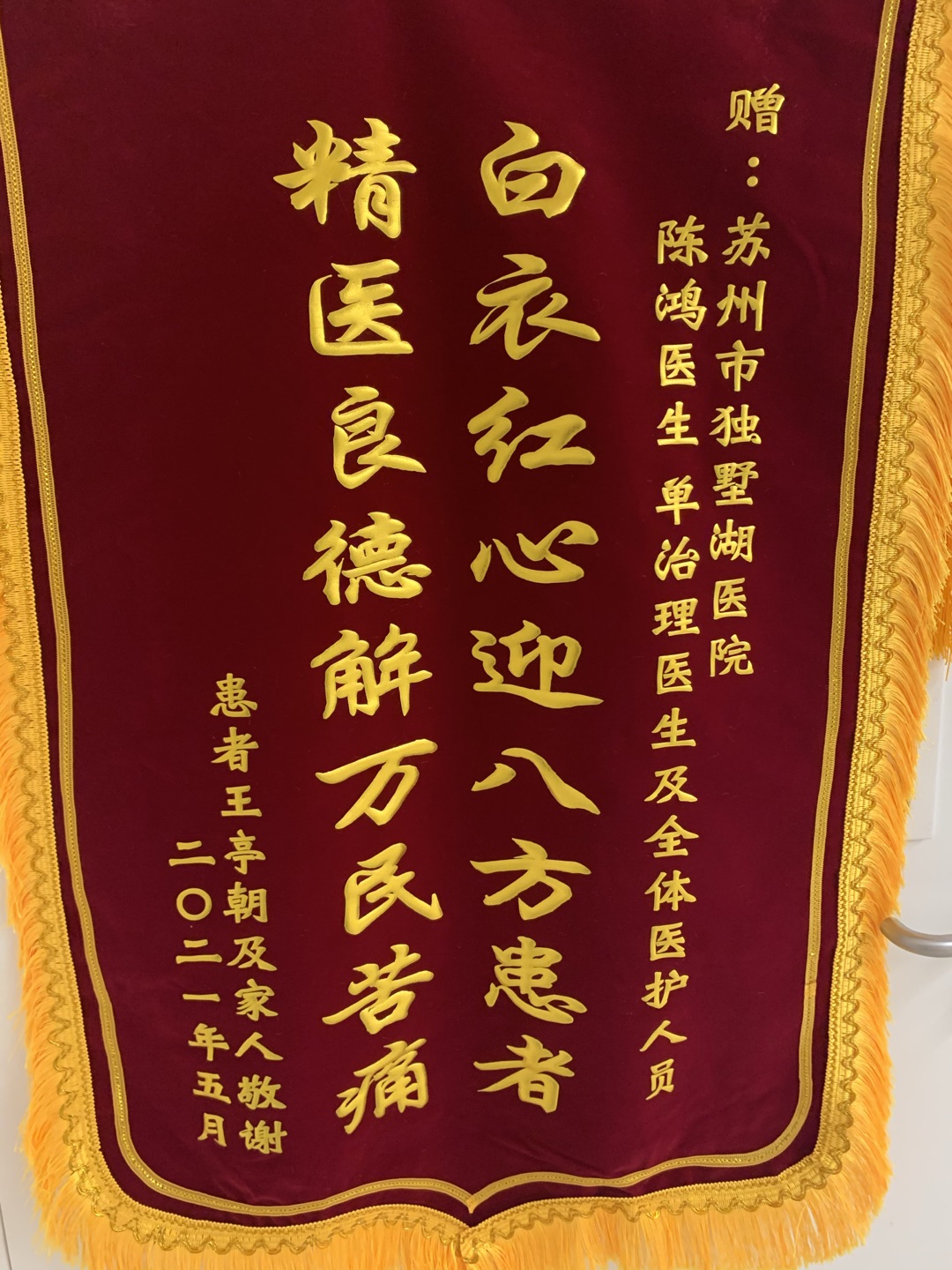 患者王先生及家人赠送锦旗感谢我院普外科陈鸿、单治理医师及全体医护人员