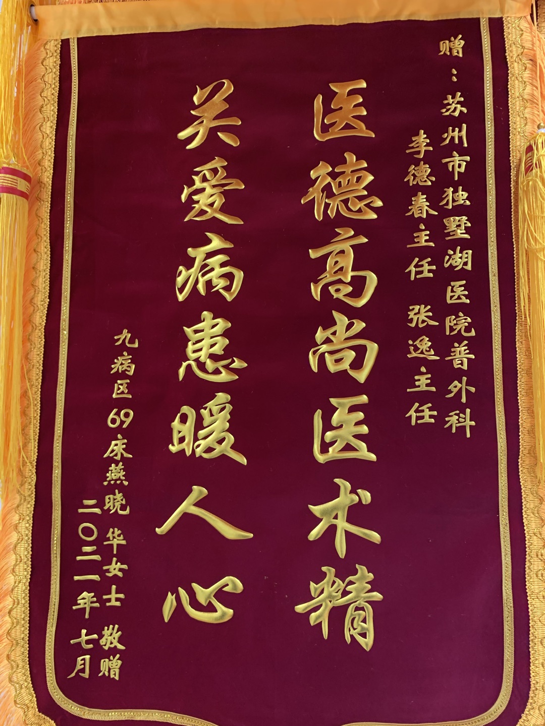 患者燕女士赠送锦旗感谢我院普外科李德春主任、张逸副主任医师
