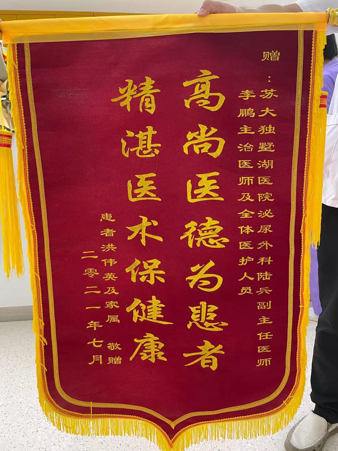 患者洪女士及家属赠送锦旗感谢我院泌尿外科陆兵副主任医师、李鹏医师