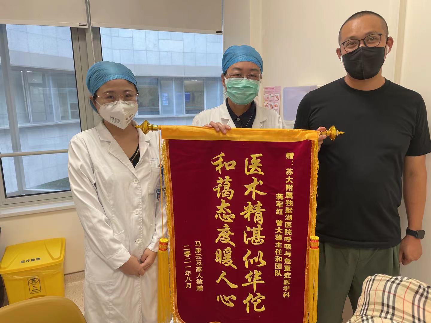患者马先生及家人赠送锦旗感谢我院呼吸与危重证医学科蒋军红主任、曾大雄副主任和团队