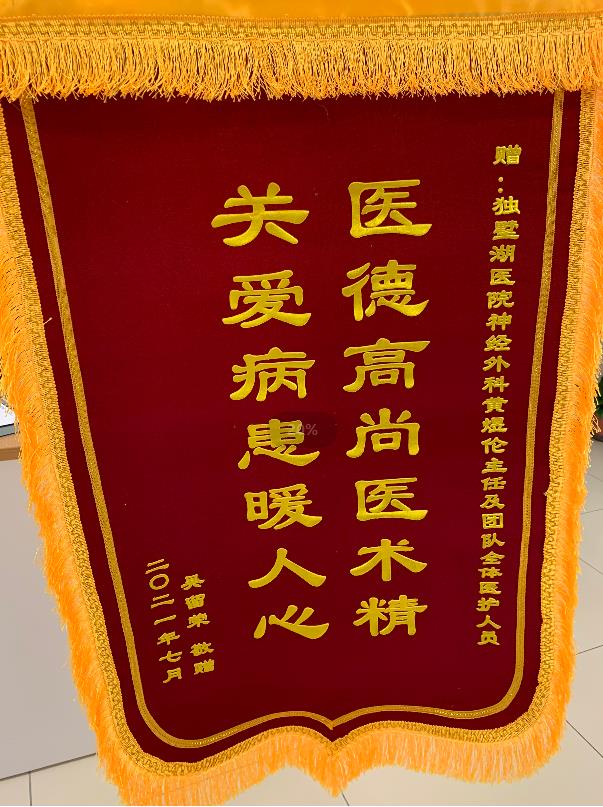 患者吴先生赠送锦旗感谢我院神经外科黄煜伦主任团队全体医护人员