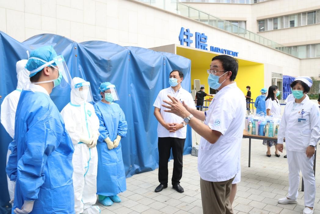 侯建全院长一行先后前往临床检测中心、预检分诊处和核酸采样点。慰问中,院领导了解了医疗救治、核酸采样检测等工作情况,对医务人员坚守岗位、甘于奉献的精神给予充分肯定,并送上慰问品。