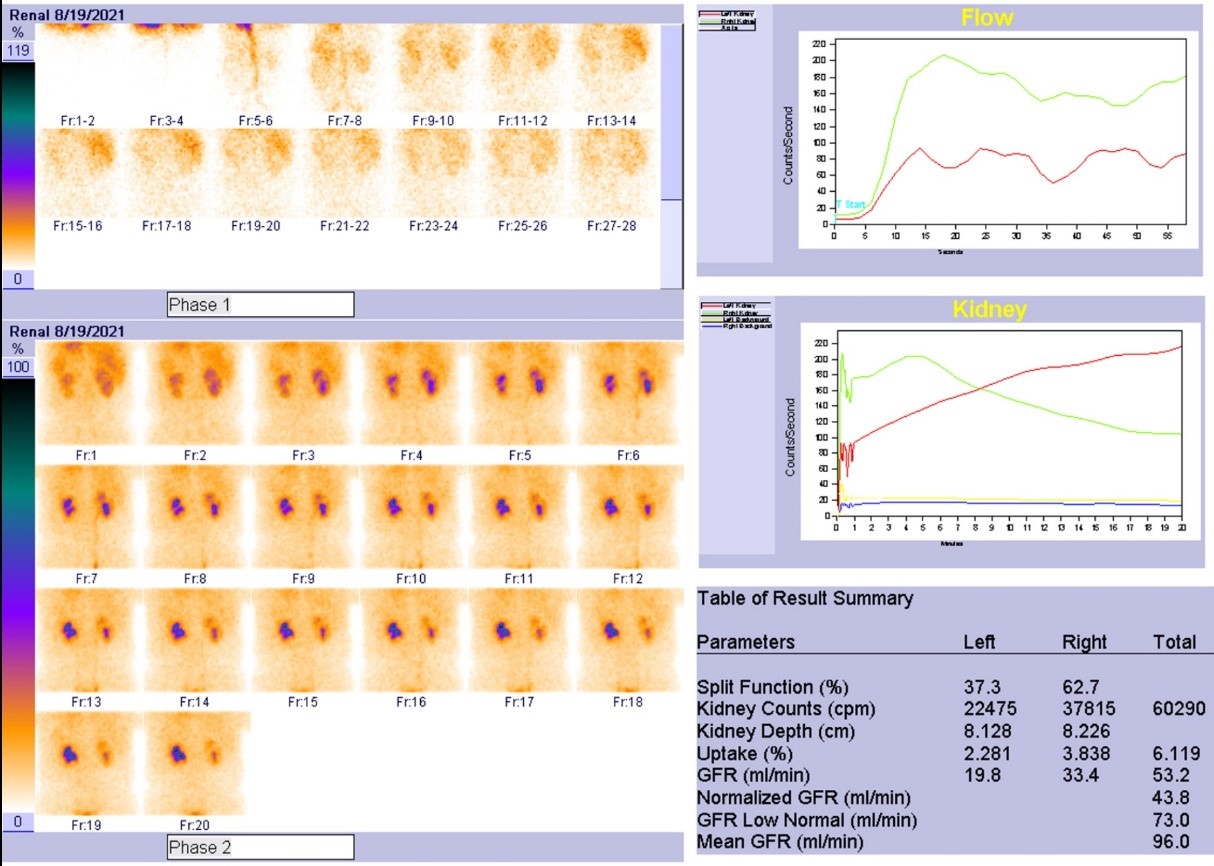 5.肾动态显像及肾图检查:评价肾功能;诊断尿路梗阻;监测移植肾血流灌注和功能情况等。