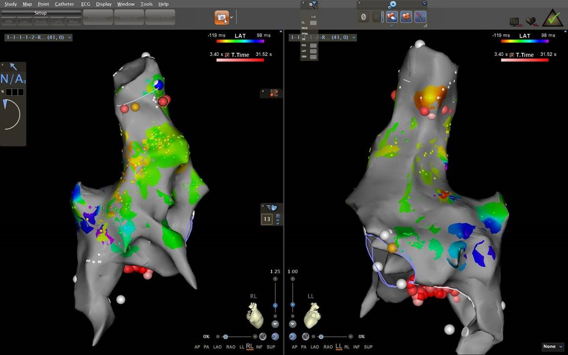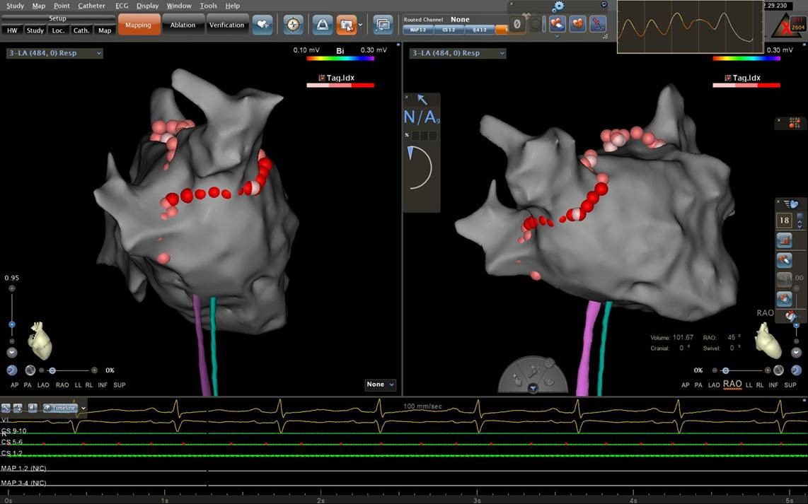 然而,术后第二天,陆女士再次出现心悸,查心电图发现为阵发性房扑。经过与家属沟通交流,独墅湖医院心血管内科手术团队决定再次为陆女士行电生理手术。此次手术过程中竟发现了两种类型的心动过速,分别为三尖瓣环峡部依赖的房扑以及上腔静脉起源的房速,于是,针对这一情况进行了三尖瓣峡部线消融和上腔静脉隔离。