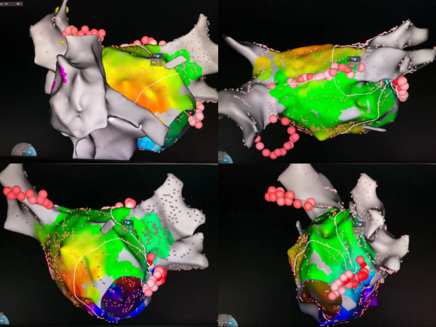 然而,陆女士出院四天后,再次出现了心悸,并且此次心悸的感觉持续得不到缓解。“忐忑”的陆女士再次来到了独墅湖医院,这次心电图提示为持续性房扑。陈弹主任医师第一时间决定,为陆女士实施第三次电生理射频消融手术。术前,独墅湖医院心血管内科团队仔细研究了手术方案,也与陆女士及其家属充分地沟通手术计划,消除了他们的疑虑与紧张。手术中,经过电生理标测提示为二尖瓣峡部依赖折返,行左房顶部线消融及二尖瓣峡部线消融,手术完成,房扑终止。