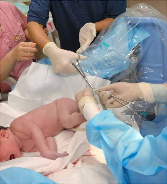 分娩时,亲切的家人在产床前陪伴、照顾,牢牢握紧产妇的手;资深的导乐师安慰、鼓励,安抚产妇的情绪;麻醉科医生为产妇及时地实施分娩镇痛,让产妇的生产体验达到最优;最专业的助产师及产科医生指导呼吸、用力,给予产妇无限的勇气和力量,所有人都在为分娩的那一刻努力。让产妇充满信心,在分娩过程中保持镇定,让宝宝平安顺利的降临。初为人父的家属怀着激动的心情亲自为宝宝剪脐带,共同庆贺新生命的诞生。