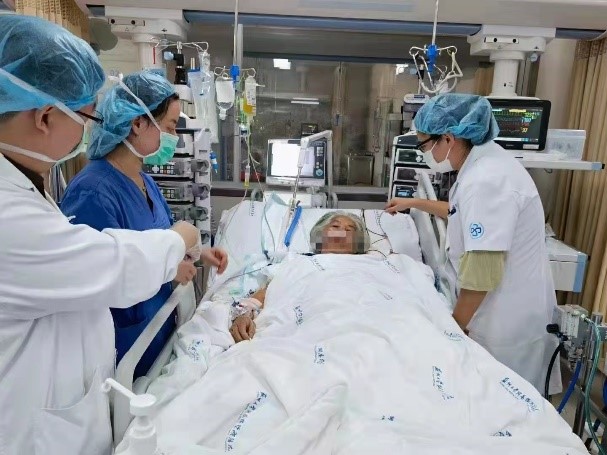 患者是一名67岁的阿婆,因上呼吸道感染后“重症爆发性心肌炎”突发呼吸困难8小时入我院急诊就诊。入院时患者已意识模糊,存在心力衰竭、呼吸衰竭等情况,突发室颤、心跳骤停,急诊医护人员紧急行心肺复苏、电除颤治疗,后行气管插管、呼吸机辅助通气。但此时床边心超显示患者左心功能极度微弱,再次出现室颤发作、心跳呼吸骤停,患者命悬一线,郭强副院长查看病人后非常重视,立即开展多学科会诊,最终确定治疗方案——尽快开展ECMO治疗,给患者带来一线希望。即刻与家属沟通病情,随后,带领团队在床旁超声引导下完成V-A模式 Cardiohelp-ECMO置管,成功转机后患者心脏负担明显减轻,但左室心肌收缩能力微弱,生命仍然危在旦夕,在我院急诊监护室进行24小时严密的监护及治疗,随时根据患者病情变化进行调整。