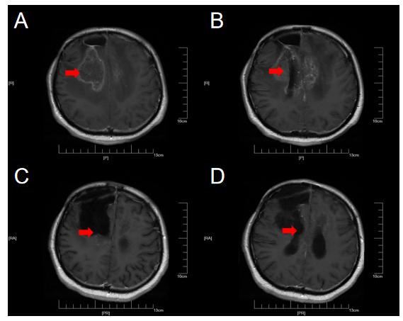 患者甲,因“癫痫大发作1次”于2018年10月6日入住上海某医院,同年10月23日在上海行手术切除治疗,术后病理为少突胶质细胞瘤(WHO III级)。术后进行规范化治疗,今年6月因右侧肢体肌力下降,复查MRI提示肿瘤复发或放射性坏死可能(下图A、B)。今年6月17日,在我院行右侧额叶异常信号切除,术后病理提示肿瘤坏死可能,患者为求下一步诊疗方案,在我院MDT门诊就诊。经胶质瘤MDT团队联合诊疗后诊断考虑为放射性坏死,予以贝伐单抗200mg q3w进行治疗,同时进行康复功能锻炼,今年9月复查MRI提示异常信号缩小(图1C,D),患者右侧肢体肌力恢复至IV-级,可在辅助物帮助下进行站立,目前治疗仍在持续中。