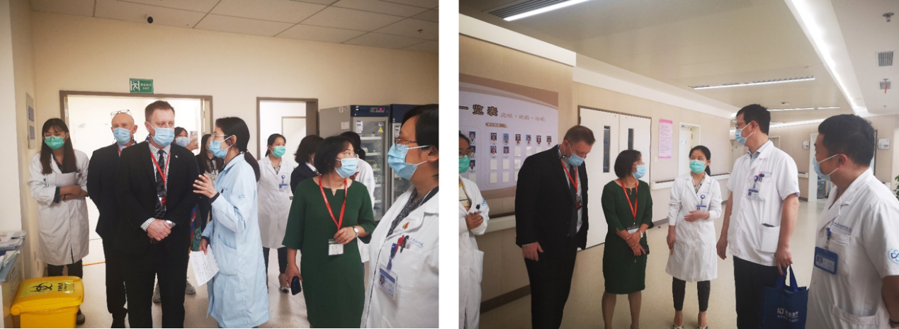 临床检测中心王琳主任向Mike O'Connor校长详细介绍了科室相关情况,带领其实地参观了实验室的智能化设施设备,并重点关注了新冠病毒检测的相关配置。