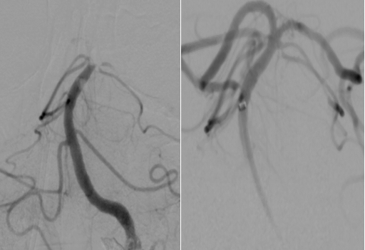由于患者错过了4.5小时脑卒中静脉溶栓救治时间,无法溶栓治疗。郝永岗副主任带领神经血管介入团队评估病情后决定在全麻下为患者实施动脉取栓术,挽救处在缺血状态尚未坏死的脑组织。麻醉科李健主任第一时间到达导管室,保障手术顺利进行,术中可见患者基底动脉末端闭塞(基底动脉尖综合征)。医生运用SWIM技术取出黑红色血栓,复查造影显示:基底动脉远端血流通畅,双侧大脑后动脉、小脑上动脉显影。术中发现患者左侧椎动脉起始部重度狭窄,于病变处植入支架一枚,血管狭窄解除,术后送重症医学科继续治疗。