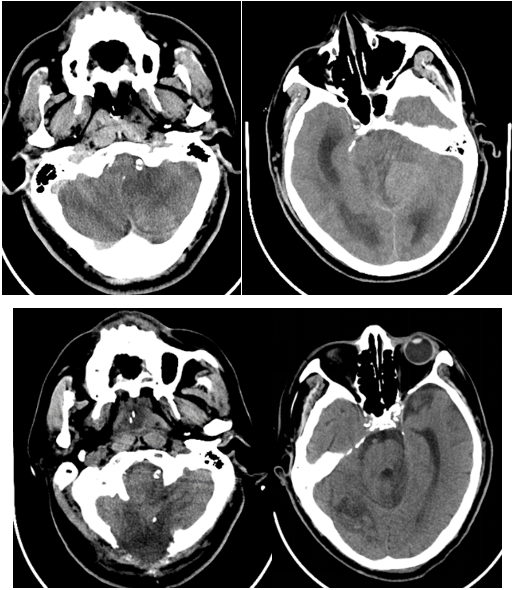 术后第四天患者出现了严重脑水肿-脑疝形成。神经外科黄煜伦主任带领神经外科团队评估后急诊行脑室外引流装置植入术+后颅凹去骨瓣减压术。