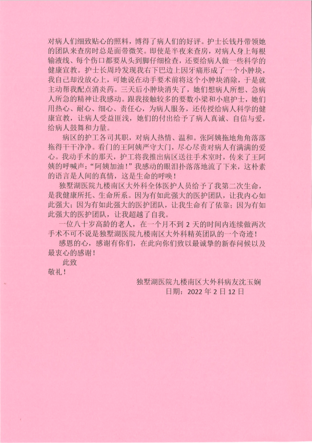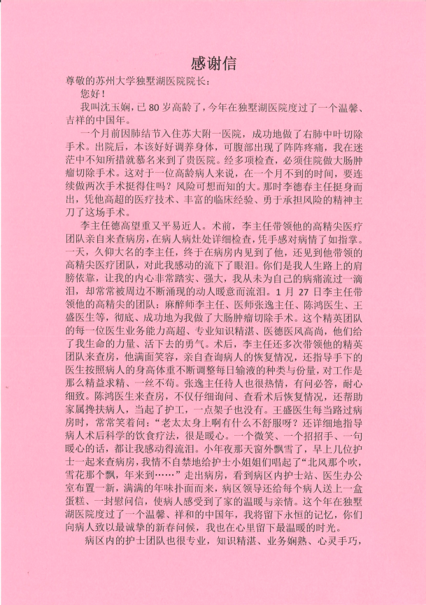 一封感谢我院普外科李德春主任及医院医护的致信