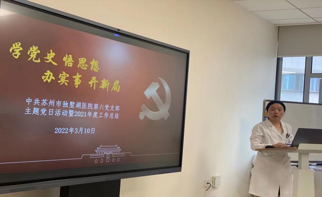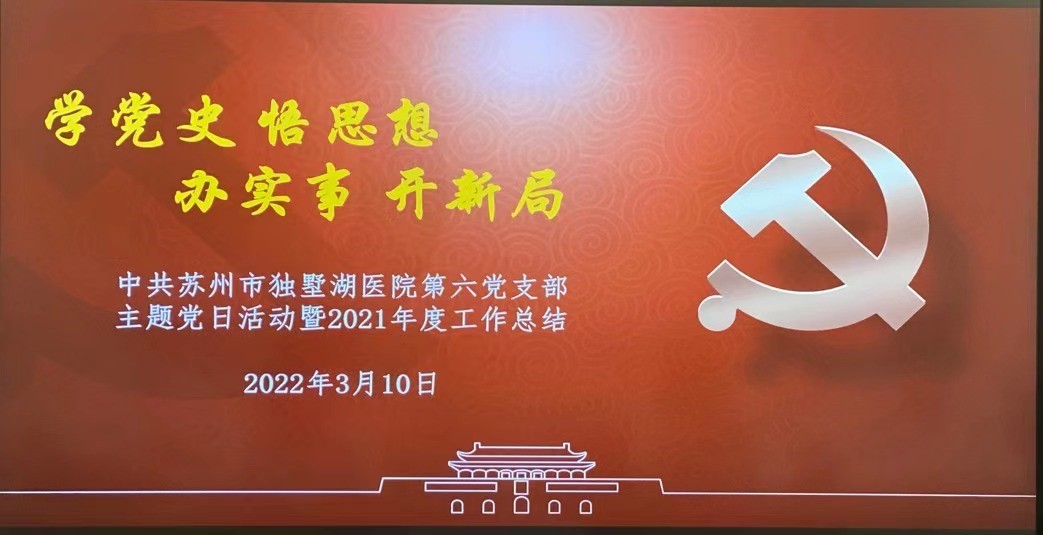 为扎实推进党史学习,总结2021,展望2022,结合本支部实际开展的工作,2022年3月10日下午,苏州市独墅湖医院(苏州大学附属独墅湖医院)第六党支部开展“学党史 悟思想 办实事 开新局”主题党日活动。本次活动特邀党政办公室主任、第七党支部书记傅强出席。第六党支部全体党员参加,活动由支部副书记马晶晶同志主持。