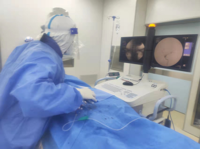 3月21日上午,杨建平副院长全程坐镇指挥,庄建平处长在发热门诊现场部署,感染管理处王秀珍副主任监控各个防护细节,李琛琛护士长协调整个转运流程。10:20,神经外科贺亮主治医师、DSA刘兆梅主管护师、DSA周宇凡技师穿着防护服、铅衣进入手术室,做术前最后调试;10 :50,患者安全转运至发热门诊手术间;11 :00,手术开始,在黄煜伦主任指导下,贺亮主治医师在局麻下帮助患者顺利地完成了脑血管造影手术。手术历时1小时20分,较一般脑血管造影手术时长延长了40分种左右,贺医生在脱下沉重的铅衣感到如释重负。好在手术未见动脉瘤等相关脑血管病,说明接下来可以按照高血压脑出血进行治疗,医生悬着的心也暂时放下了。