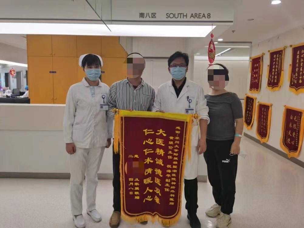 手术按计划有条不紊地进行,手术过程中,医生需要克服手术过程中面屏上凝结有雾气等不利因素,保证手术顺利完成。杨建平副院长,郭强副院长、庄建平主任全程在视频监护系统中关心整个手术过程。医生于一小时内完成了脑室外引流以及颅内压探头置入术,患者复查CT后,安返病房。6天后,患者14天隔离期结束,转入普通病房,经过了水肿期,神志转清,于4月6号顺利出院。出院前,患者特意定制了两面锦旗,一面赠送发热门诊全体医护人员,一面赠送神经外科医护人员。4月27号,患者前来复查,恢复如初,没有任何后遗症。患者表示,对10余天来脑室出血的事情已经完全不记得了,患者夫人表示隔离时期发生这么惊心动魄的事让她永生难忘,感谢独墅湖医院的全体医护人员!