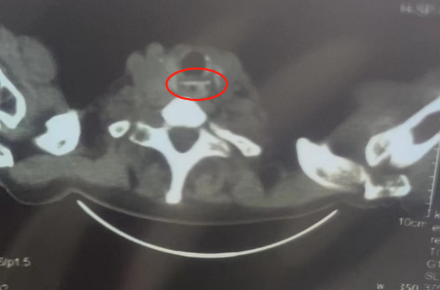 医务处、感控处多方联动,立即将患者闭环转诊至我院发热门诊。经仔细询问病史,5小时前,老人家不慎吞食鸡骨。在随后的CT检查中,发现一根长约2cm的鸡骨头横跨在食管颈部,一端刺入食管壁,给造成患者极大的痛苦。病情紧急,时间较久,一旦刺穿,会造成感染,严重时危及生命。