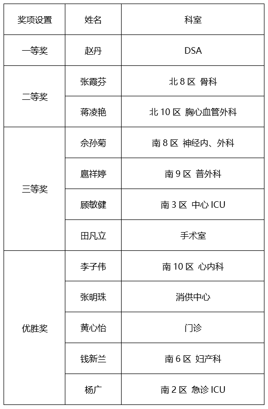 (心内科:李子伟;消毒供应中心:张明珠;伤口护理门诊:黄心怡;妇产科:钱新兰;急诊ICU:杨广)