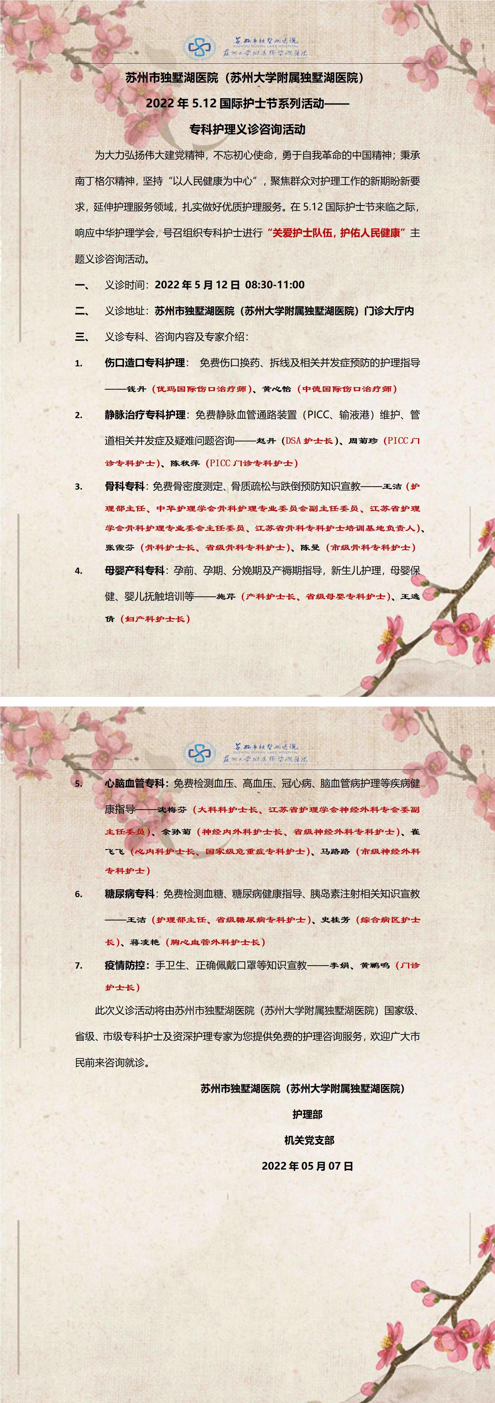 苏州市独墅湖医院(苏州大学附属独墅湖医院)2022年5.12国际护士节系列活动——专科护理义诊咨询活动