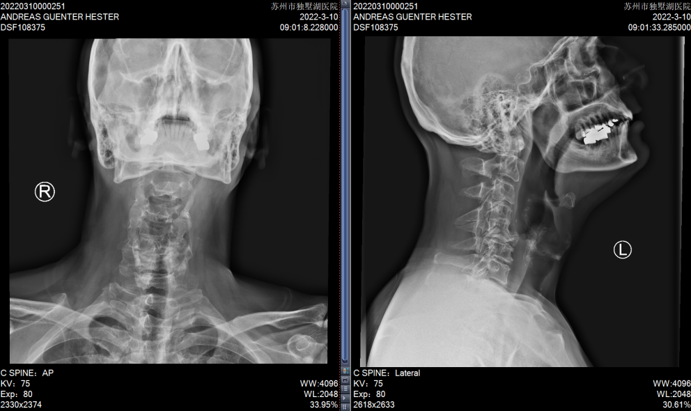 Hester辗转多家医院寻求帮助,其中包括上海著名的三甲医院,都建议手术治疗,他因为担心疗效而犹豫不决。病情的不断加重又使他心急如焚。今年3月初,通过其他专业人士推荐,他前来我院骨科姜为民主任的高级专家门诊就诊。姜主任在仔细询问了他的病史、阅读了他的影像学资料并进行了全面的体格检查后,告诉他共有3个方面的问题:1.颈椎的第四(C4)和第五节椎体(C5)先天发育异常,分节不全;2.C5-6椎间隙倾斜,颈椎侧凸畸形同时伴严重的骨质增生和椎间盘退变。3.磁共振检查显示在C5/6和C6/7水平脊髓严重受压伴脊髓信号明显改变,说明神经损伤已相当严重,尽快手术治疗是唯一的选择。他觉得姜主任对病情的判断与建议与他德国的医生完全一致。“It is a good decision to receive the treatment in the professional hospital which gives me a good feeling at the first sight.”(这是一个正确的决定,我第一眼看到这家医院,就觉得非常的专业)。 在Hester后来的感谢信中写道:Also, the talk with Dr. JiangWeimin and his assistant Dr. Zhao gave me very good feelings. They spent enough time explaining to me with understandable words. It was the professionality of these doctors and the public hospital itself that convinced me to do the next treatment.(姜为民主任和他的助手赵博士与我的交谈非常融洽,他们用通俗易懂的语言耐心地向我解释病情,独墅湖医院是公立医院,专家们所展现出的专业性让我心悦诚服,因此我决定就在这儿接受进一步的治疗)。