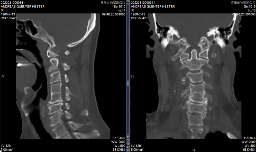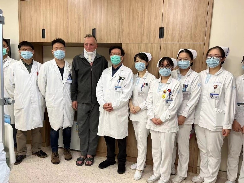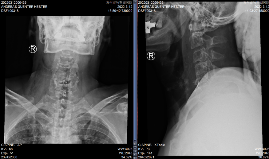 Hester说他早在2014年时就因为腰椎间盘突出症在德国韦德尔医院接受过手术。“当时为我手术的医生曾说,我的颈椎也有不可忽视的问题,不久的将来可能也同样需要手术治疗。” Hester表示,从2019年开始他的右手的就已感到麻木,起初是小指,后来逐渐加重,多个手指和整个手臂出现麻木,直至出现四肢麻木,行走不稳。他本想等下一次回德国后接受颈椎手术治疗,但突如其来的新冠疫情,加之工作繁忙,让他的治疗一拖再拖。直到2021年,他行走已经明显地不平稳,时常感觉自己仿佛踩在棉花上。“我甚至无法独自上下楼梯” ,这时他才开始真正着急起来。