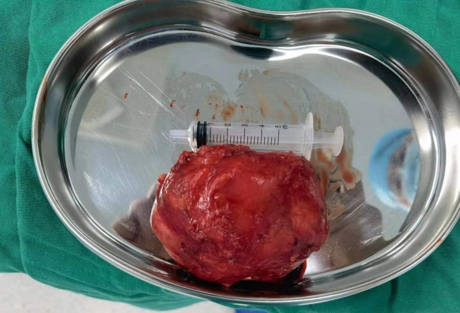 因为肿块和血管、神经的关系紧密,接诊医师建议她到血管外科与介入科就诊。为了明确肿块的性质,确定手术预案,程龙副主任医师先在彩超引导下用一根很细的穿刺针从肿块内部取出了一条肿块组织进行病理检查。两天后,病理报告提示为孤立性纤维瘤。这是一种比较罕见的肿瘤,而且有一定的恶性比例,这也就意味着手术必须完全切除肿瘤,如果残留一点都可能导致术后的复发、转移。以张喜成主任为首的几位血管外科专家在术前与相关科室多次探讨了手术方案,若要切除该肿瘤,它与周围重要血管神经的紧密粘连便是一项“大考验”!既要把肿瘤切干净,又要保护血管神经,否则可能会导致左上肢残疾。必要时可能还需要准备同时做人工血管移植,其中的难度可想而知。于是,他们就围手术期管理,麻醉术中的监护、术后的治疗等拟定了详尽的手术方案。