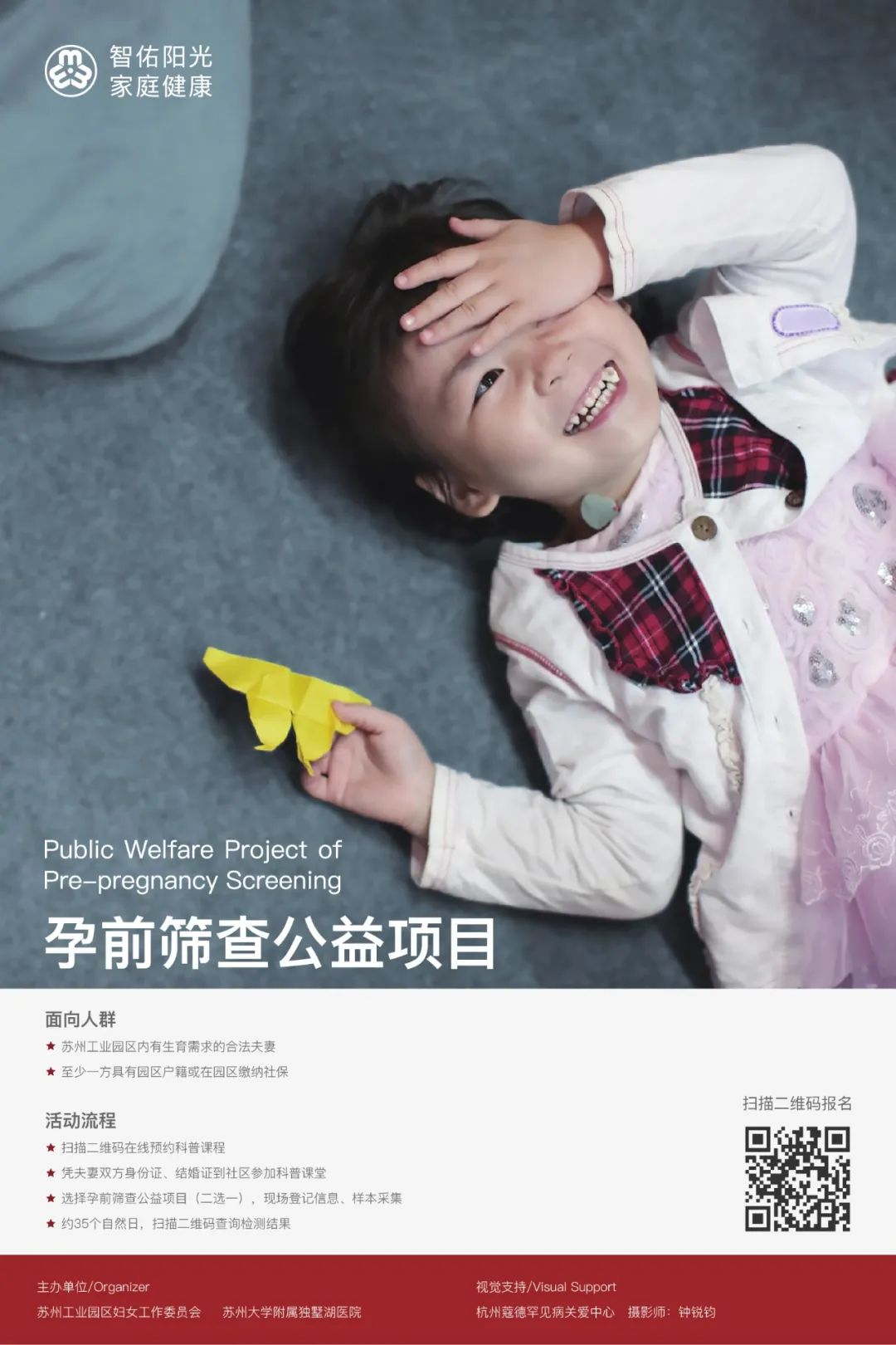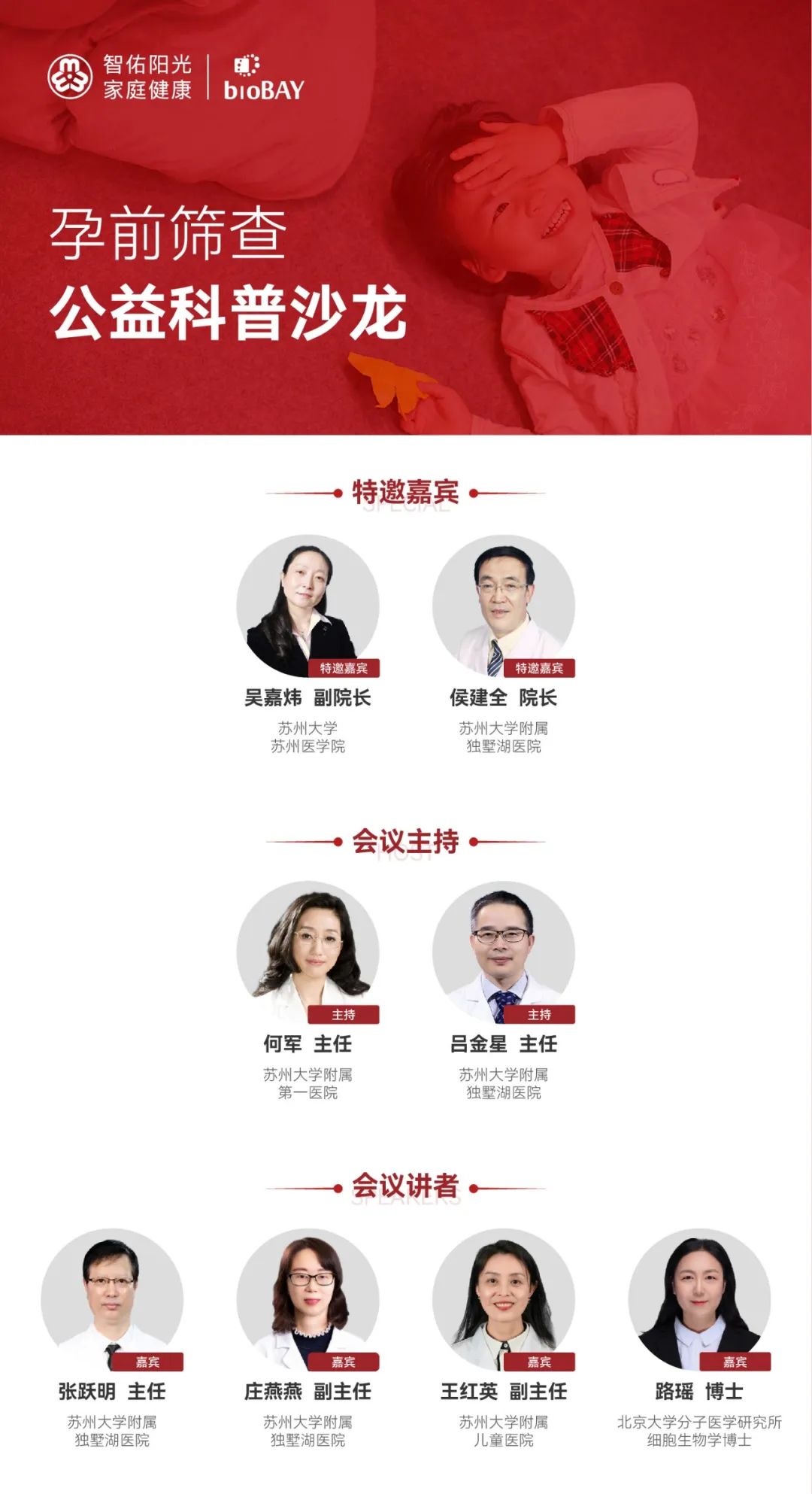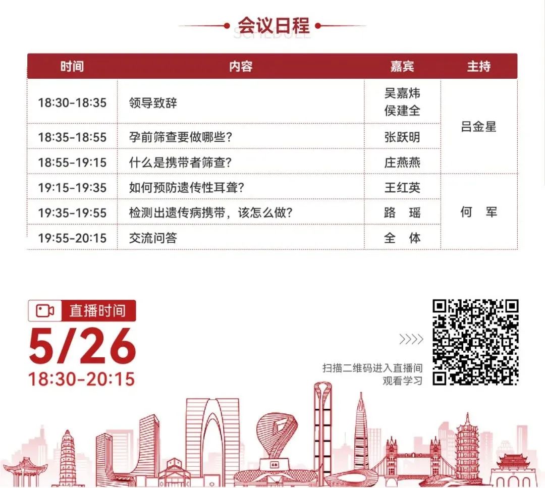 预告,预告!5月26日,由苏州工业园区妇工委主办的孕前筛查公益项目将会举办一场线上沙龙交流会。会议特别邀请到了苏州大学苏州医学院副院长吴嘉炜、苏州大学附属独墅湖医院侯建全院长及苏州大学附属第一医院、苏州大学附属儿童医院、北京大学分子医学研究所等多位专家学者进行专题科普,在线解答听众有关孕前筛查等方面的种种疑惑,帮助园区育龄夫妇优生。