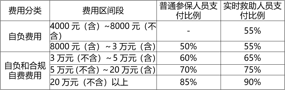 大病保险按自然年度(1月1日-12月31日)进行累计,参保人员在年度内发生的自负费用累计达到8000元以上的,超过8000元的部分,大病保险分费用段按比例支付;参保人员在年度内发生的自负费用和合规自费费用合计超过30000元的部分,大病保险分费用段按比例支付。《苏州市社会医疗救助办法》中规定的实时救助人员,年度累计自负费用起付标准降低至4000元,各费用段支付比例各提高5个百分点。具体费用段和支付比例如下: