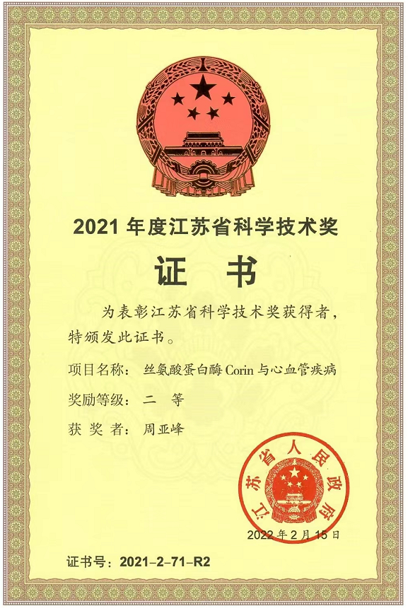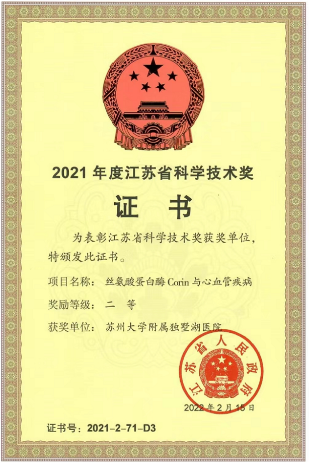 6月9日,江苏省省委、省政府举行的全省科学技术奖励大会在南京举行,大会颁发了2021年度各项科技奖项。苏州大学附属独墅湖医院副院长周亚峰教授参与的项目“丝氨酸蛋白酶corin与心血管疾病”获江苏省科学技术二等奖。该奖项也是我院获得的第一个省部级科学技术奖,也是周亚峰教授自2015年获得江苏省科技进步一等奖(生物起搏应用于缓慢性心律失常治疗的相关研究)以来的第二个江苏省科技进步奖。
