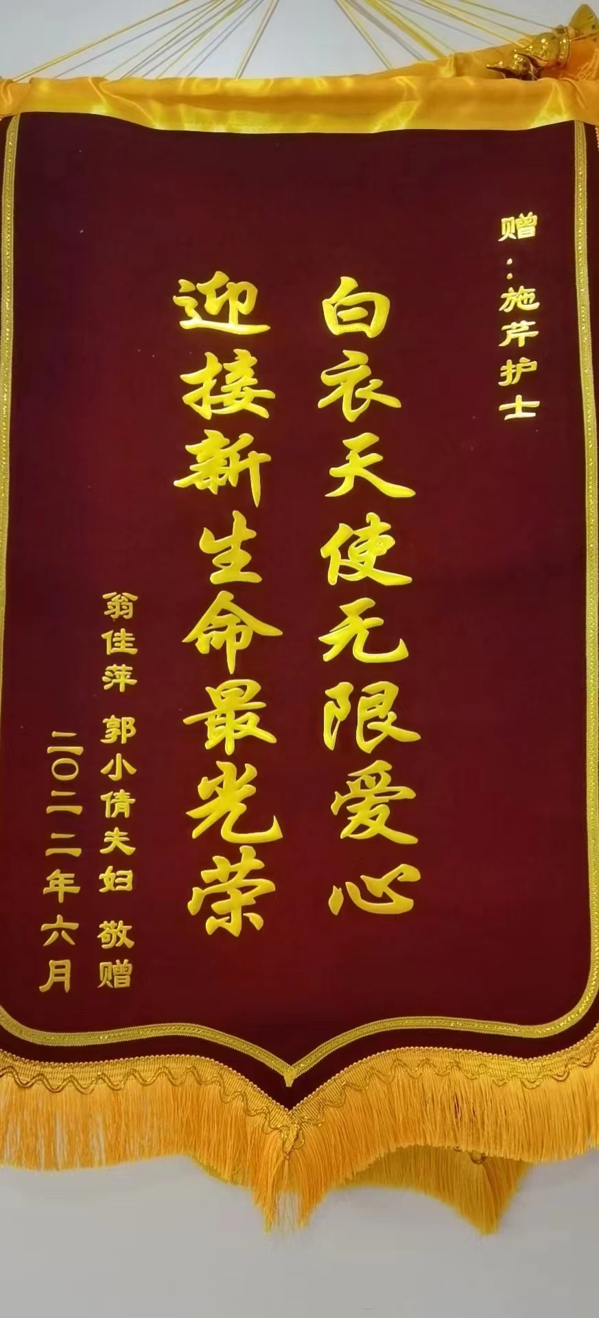 患者翁女士赠送锦旗感谢我院妇产科施芹护士长