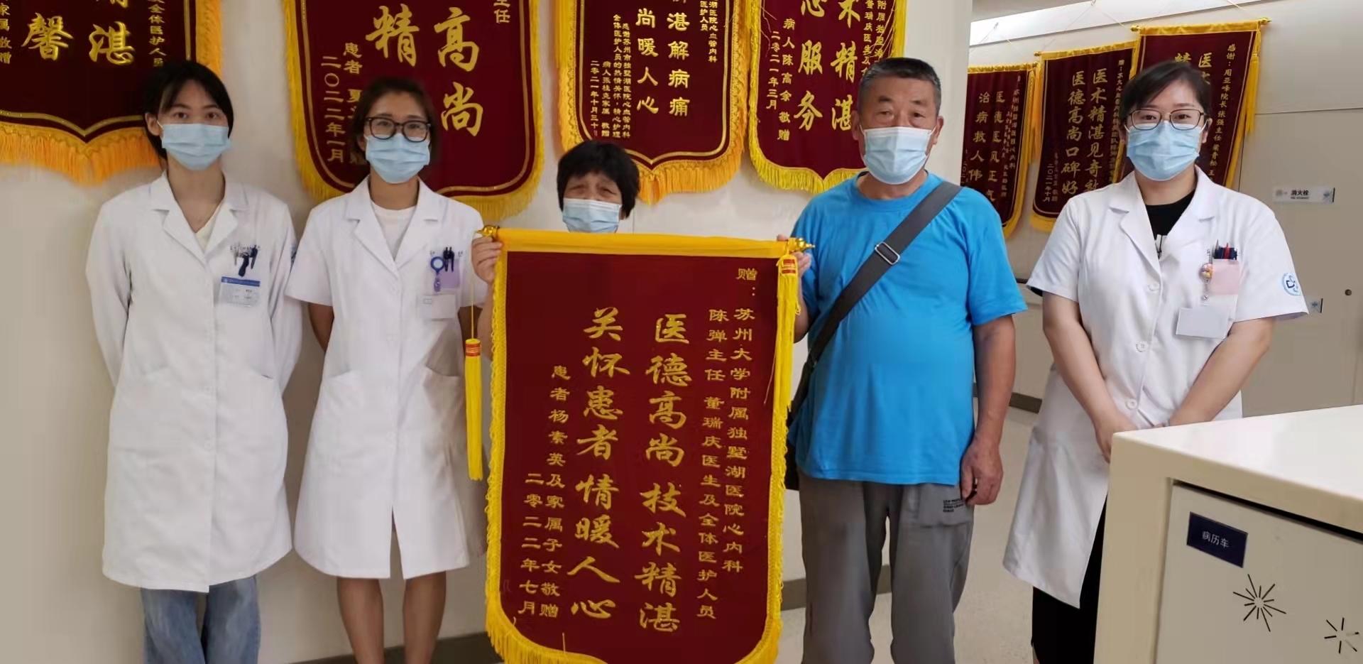 患者杨女士及家属赠送锦旗感谢我院心内科陈弹主任、董瑞庆医生及全体医护