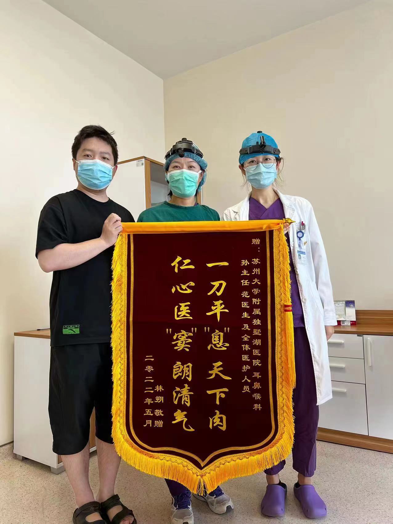 患者林先生赠送锦旗感谢我院耳鼻咽喉科孙玲莉副主任医师、范佳芸医生及全体医护