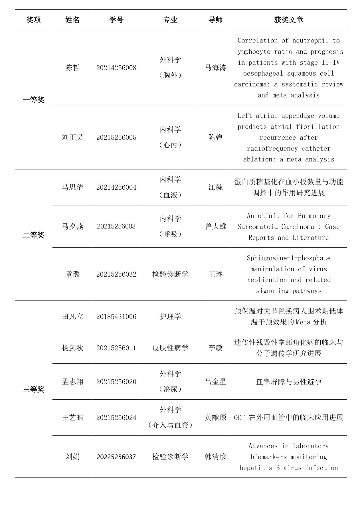 根据独墅湖医院研究生首届文献综述评比活动的通知要求,经学生提交参评文章、科教处初审、资深专家评审,现将获奖名单公式如下。