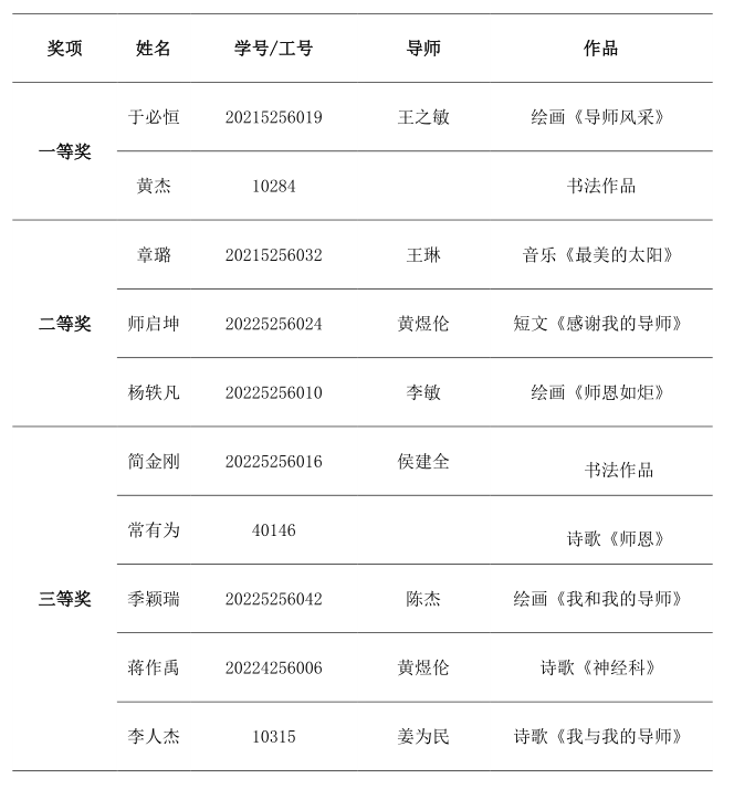 根据“沐杏雨,念师恩”——教师节主题活动之“我与我的导师”主题创作作品征集活动通知要求,现将获奖作品名单公示如下: